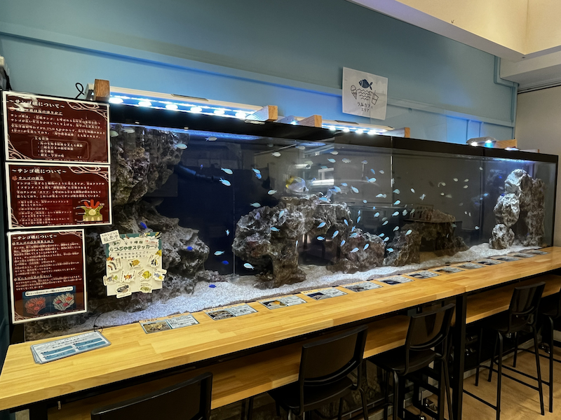 宮古島の周辺の豊かな海を再現した大型水槽を眺めながら、軽食やドリンクを楽しめるエリア